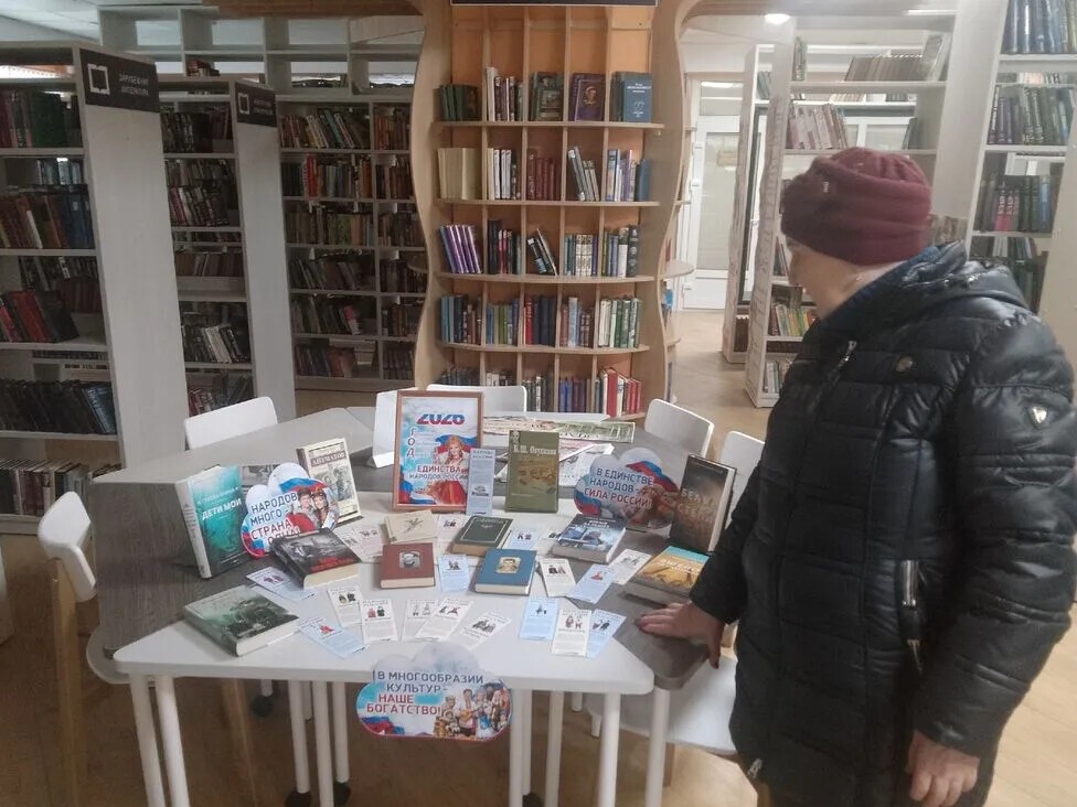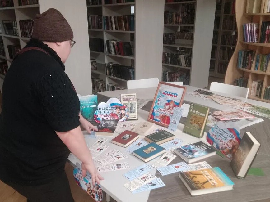2026 год — Год единства народов России. В Кашарской центральной библиотеке библиотекарь Елена Станиславовна Боброва подготовила книжную выставку, объединившую произведения писателей разных национальностей, пишущих на русском языке.