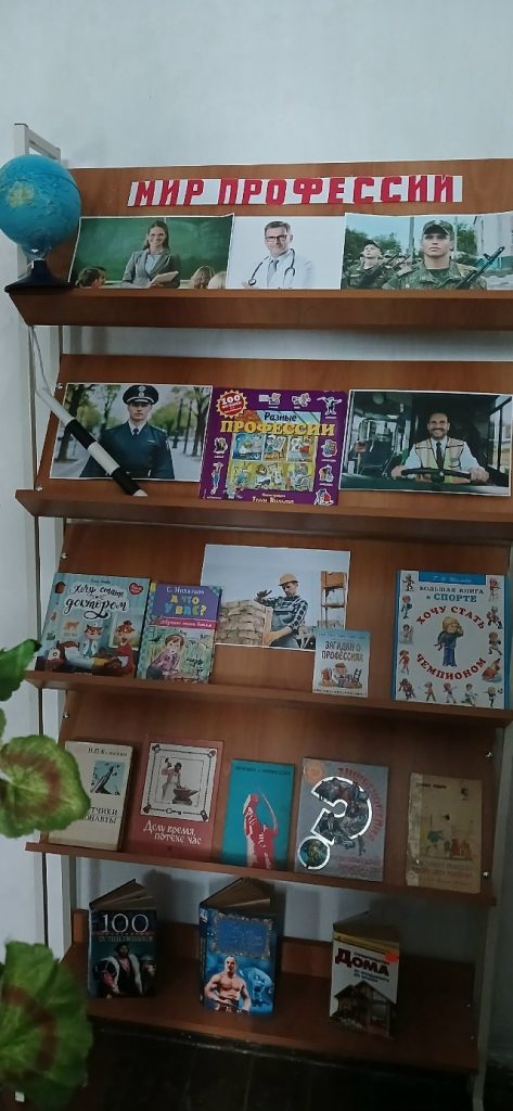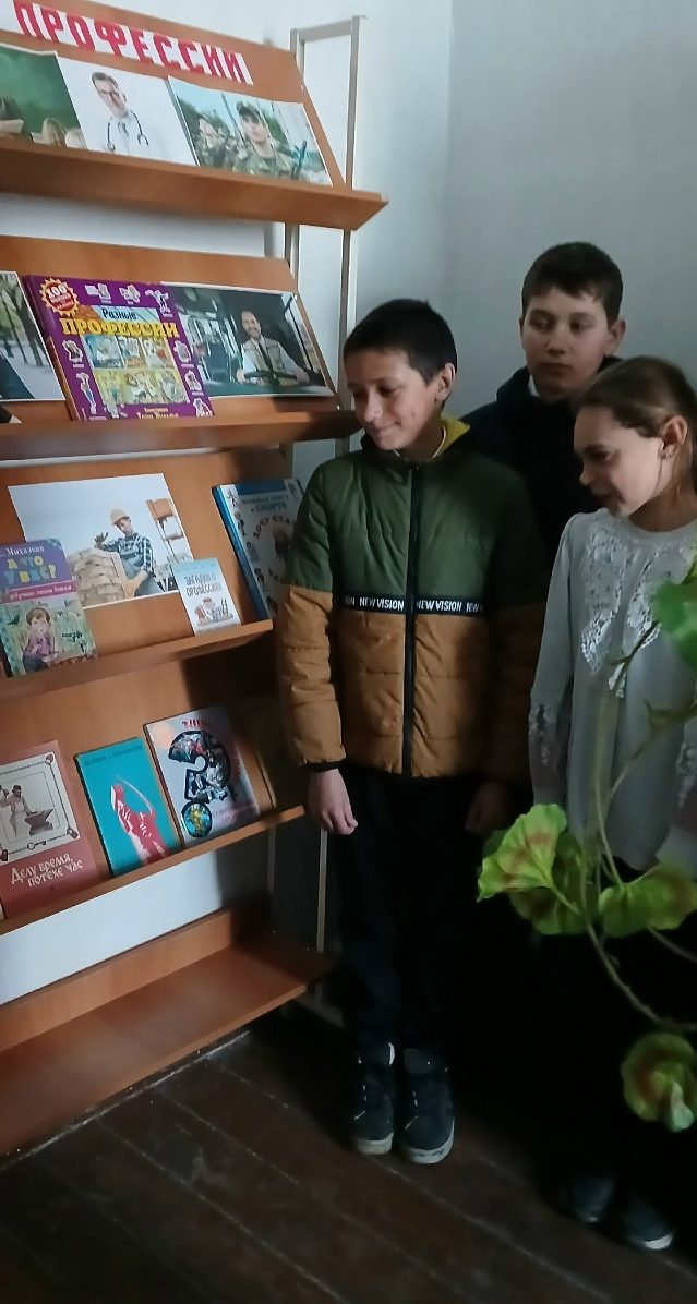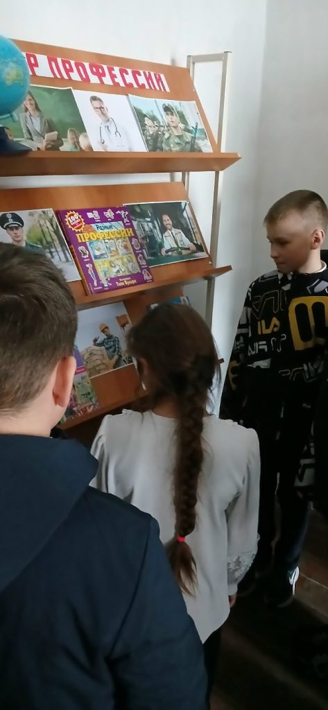 Особое внимание привлекла книжная выставка «Мир профессий», на которой были представлены книги о современных и «классических» профессиях: учитель, врач, военный, шофёр, механизатор, полицейский, строитель. Библиотекарь объяснила, что эти специальности всегда нужны и важны.