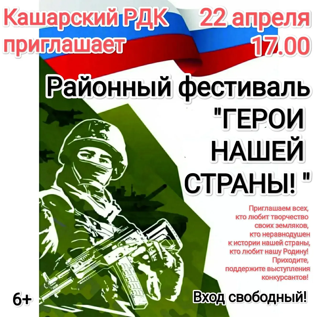22 апреля в Кашарском районном Доме культуры состоится фестиваль «Герои нашей страны». Начало — в 17:00.