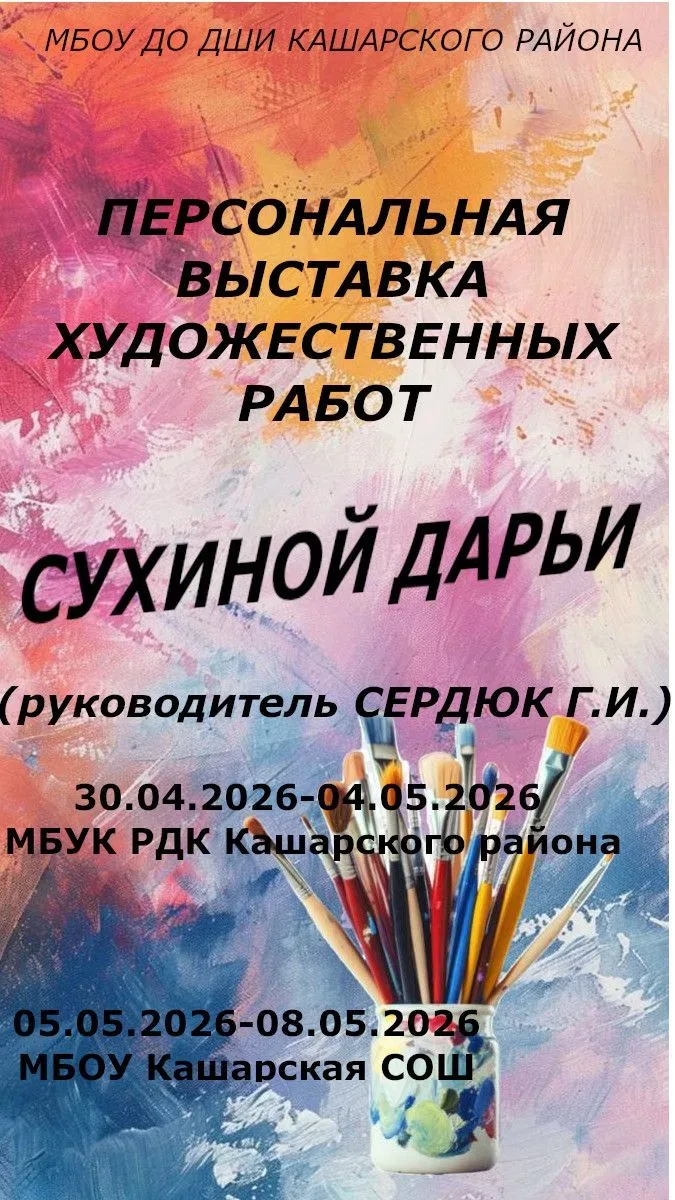 В Кашарском районном Доме культуры откроется персональная выставка художественных работ талантливой ученицы детской школы искусств — Дарьи Сухиной. Юная художница занимается под руководством преподавателя Галины Ивановны Сердюк.