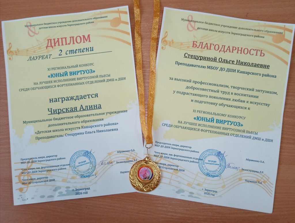 В апреле 2026 года обучающаяся фортепианного отделения детской школы искусств Кашарского района Алина Чирская (3 класс, преподаватель О.Н. Стецурина) приняла участие в XI Региональном конкурсе фортепианного исполнительства «Юный виртуоз». Конкурс на лучшее исполнение виртуозной пьесы среди учащихся ДМШ и ДШИ Ростовской области проходил в Зерноградском районе.