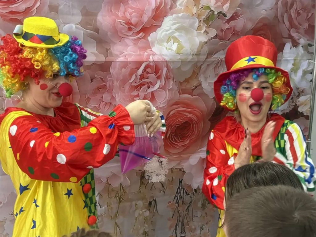 Вместе с клоунами дети разгадывали забавные загадки, хохотали над смешными историями и участвовали в интерактивных играх. Настоящий восторг вызвали фокусы: вода окрашивалась на глазах, а проткнутый цветными карандашами пакет с водой не пролил ни капли!