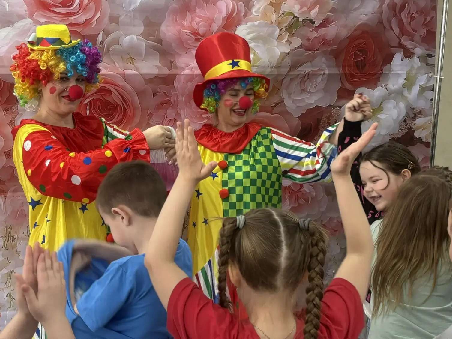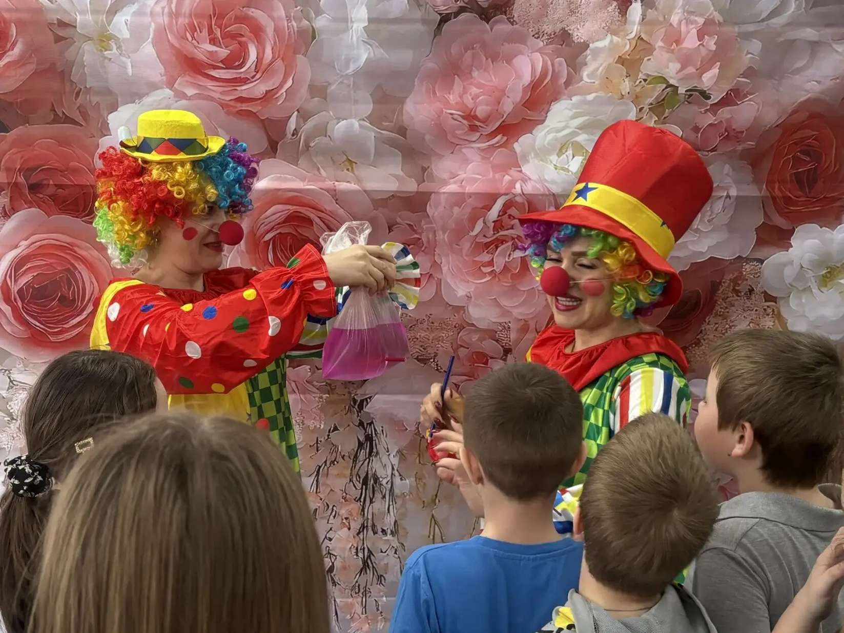 Вместе с клоунами дети разгадывали забавные загадки, хохотали над смешными историями и участвовали в интерактивных играх. Настоящий восторг вызвали фокусы: вода окрашивалась на глазах, а проткнутый цветными карандашами пакет с водой не пролил ни капли!