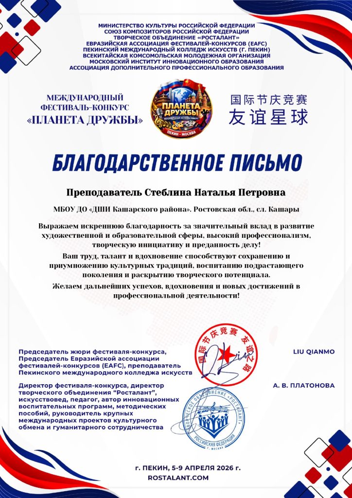 В апреле 2026 года обучающийся исполнительского отделения народных инструментов Детской школы искусств Кашарского района Сергей Иваненко (класс преподавателя Н.П. Стеблиной) принял участие в Международном фестивале-конкурсе «Планета Дружбы».