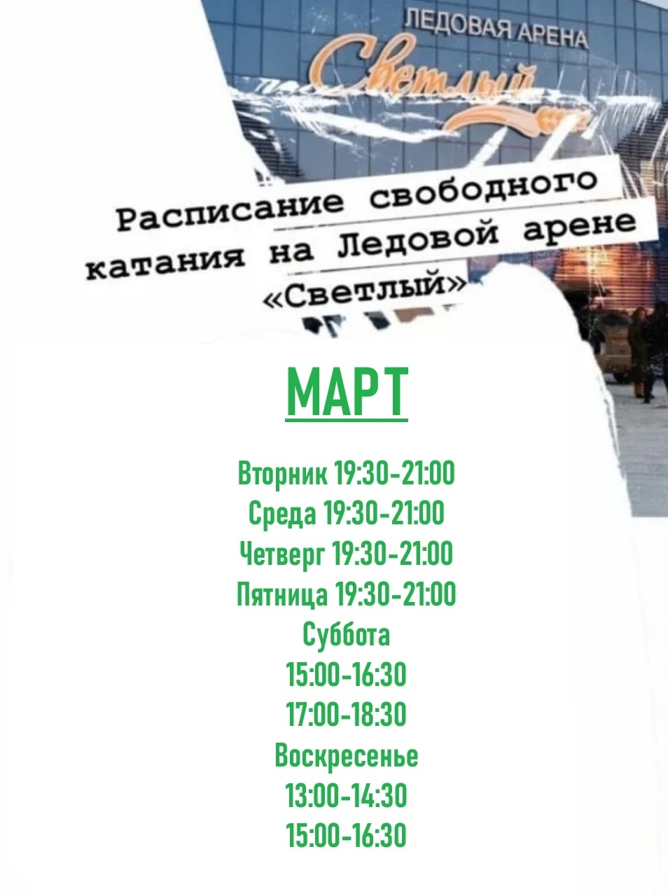Не упустите возможность провести время с пользой и удовольствием! Лёд, свежий воздух и отличное настроение гарантированы!