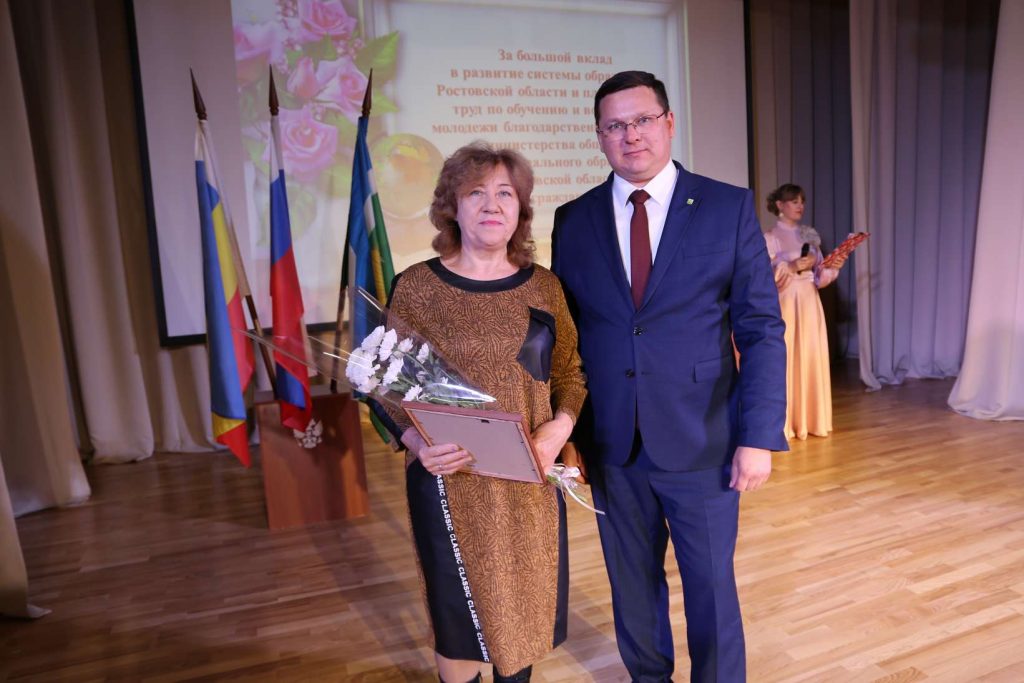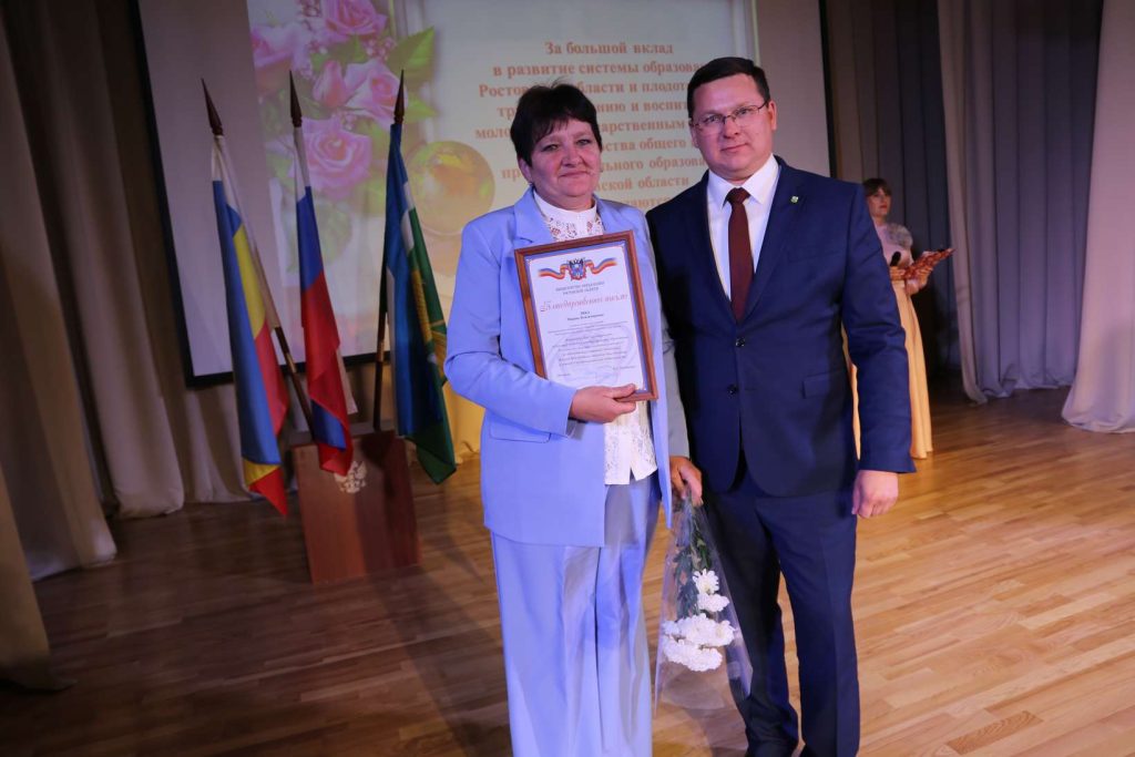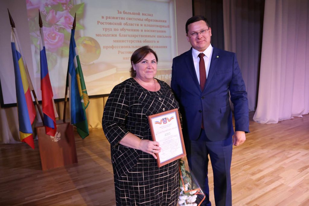 За большой вклад в развитие системы образования Ростовской области и плодотворный труд по обучению и воспитанию молодежи Благодарственное письмо министерства образования Ростовской области вручено: