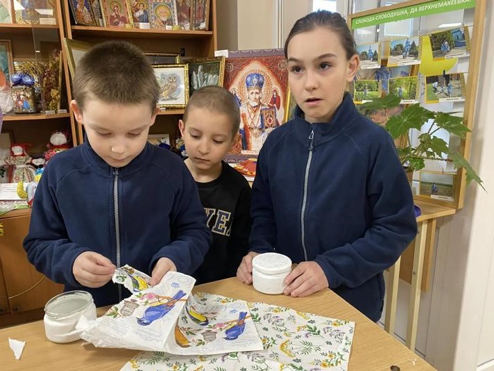 После игрового блока перешли к творчеству — мастер-классу по технике декупаж. Под руководством взрослых ребята освоили базовые приёмы декорирования, узнали о материалах и инструментах. В результате каждый создал небольшой авторский предмет, который стал памятным сувениром с этой встречи.