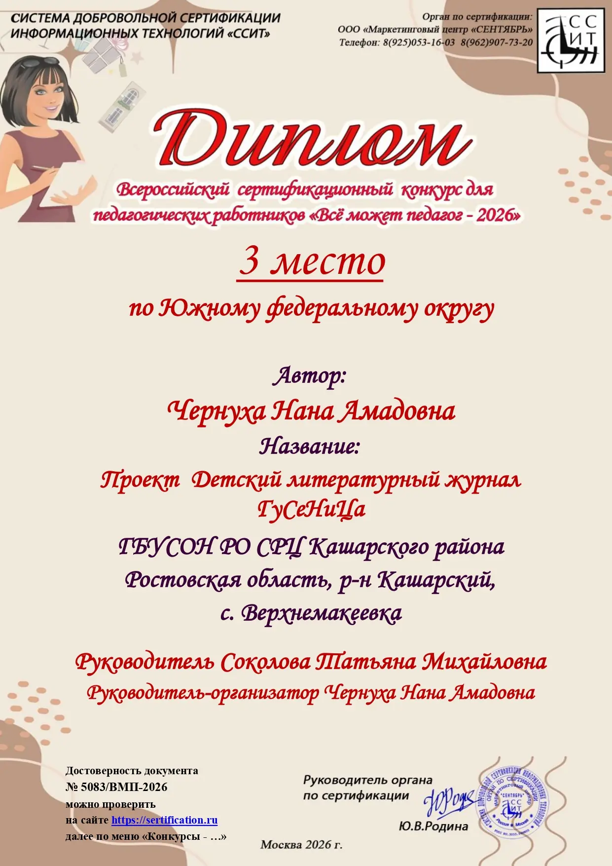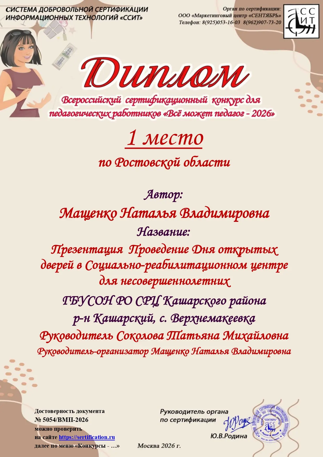 Чернуха Нана Амадовна заняла 3-е место среди педагогов Южного федерального округа — жюри высоко оценило её инновационный подход и результативность в решении сложных социально-педагогических задач. Мащенко Наталья Владимировна стала первой в Ростовской области — её победа — результат многолетней практики и искренней преданности делу.