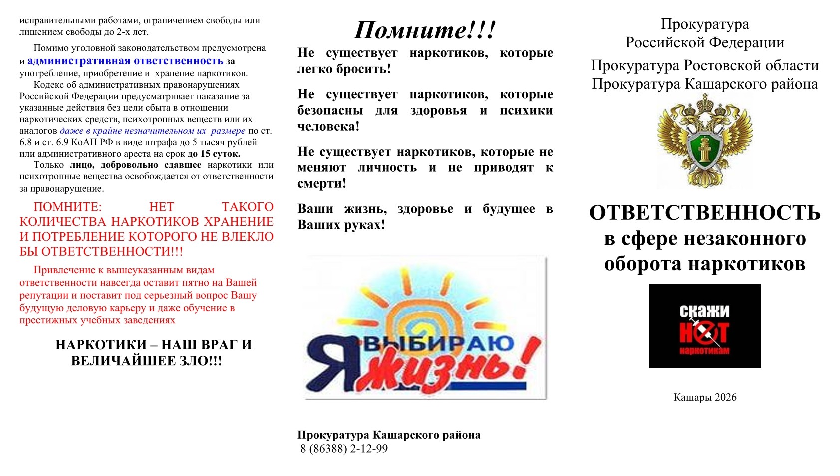 Главная » #Прокуратура района Прокуратура Кашарского района: ответственность в сфере незаконного оборота наркотиков На чтение 1 мин Просмотров 22 Опубликовано 16.04.2026 17:01 Наркотики – наш враг и величайшее зло!!! Новости СМИ2