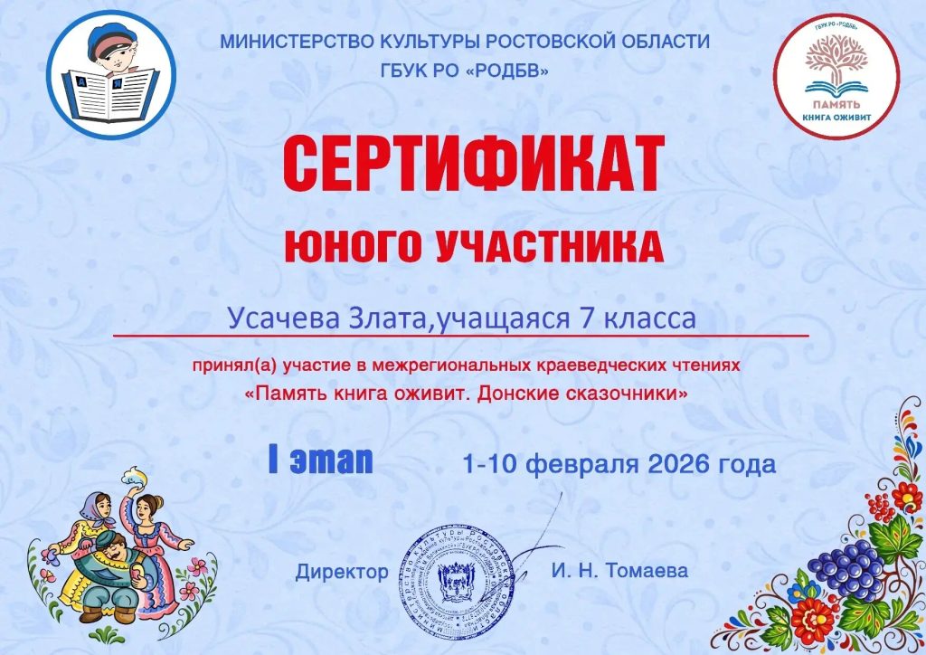 Юные читатели подготовили видеоролик с отрывком из сказки Петра Лебеденко «Петрусь – мальчонка русский». Проникновенное прочтение произведения донского автора не осталось незамеченным — Злата и Ваня получили сертификаты юных участников первого этапа чтений.