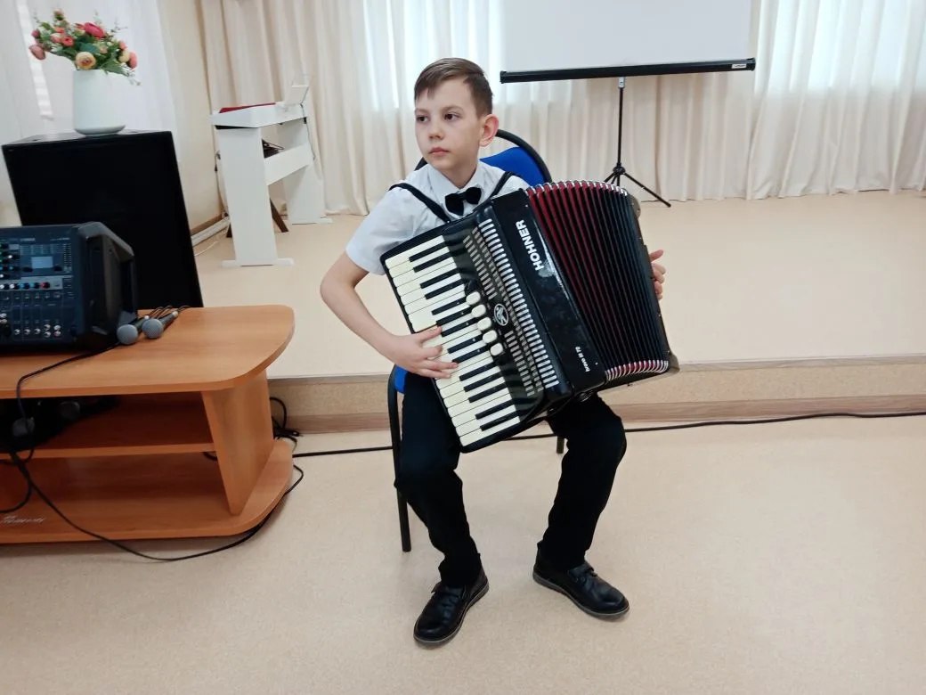 Особым подарком стало выступление вокалистки. Ефросинья Коротченкова (класс преподавателя Ирины Александровны Лесных) исполнила народную песню «Куры рябые». А аккомпанировал ей… конечно, баян! Сергей Иваненко чутко поддерживал певицу, и этот дуэт тронул сердца всех зрителей.