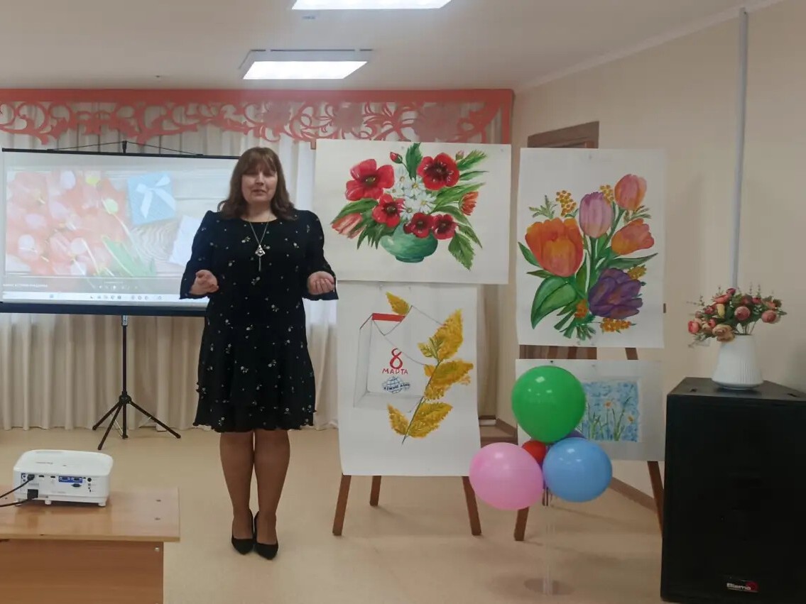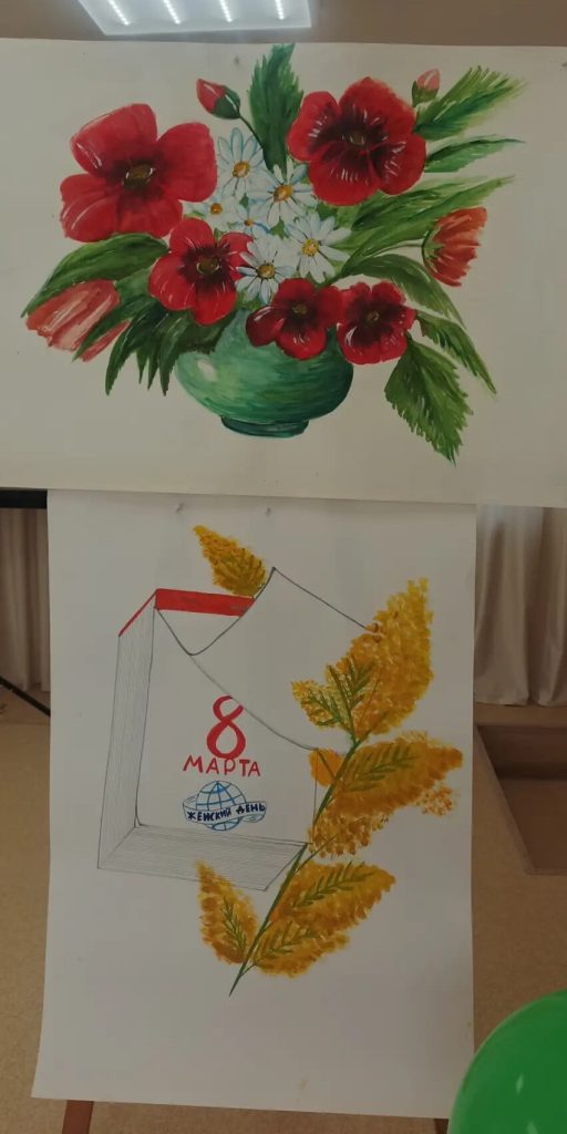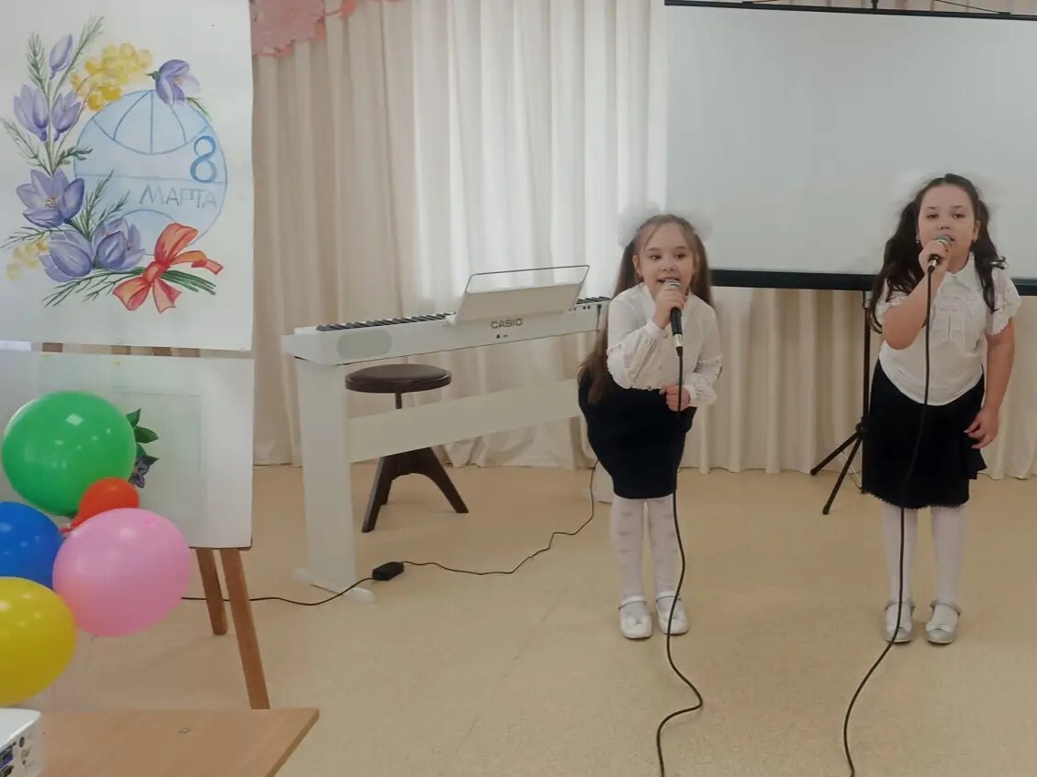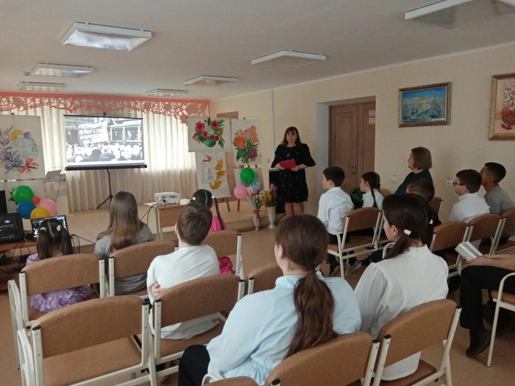 Зал расцвёл яркими красками — стены украсили рисунки учеников отделения ИЗО, которые словно сами тянулись к солнцу. А на экране оживала история: детям показали видео о том, как появился праздник 8 Марта, и рассказали о женщинах, которые первыми покоряли небо, науку, сцену и космос.