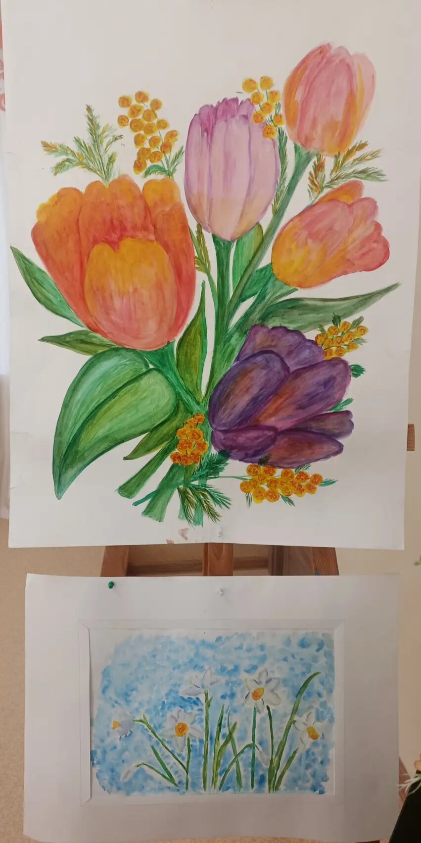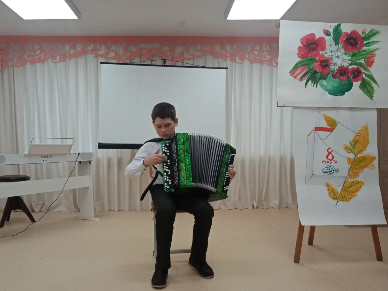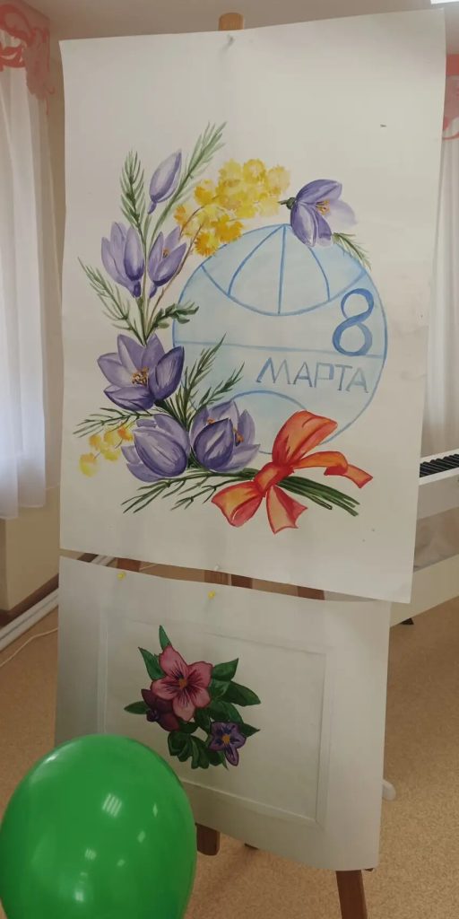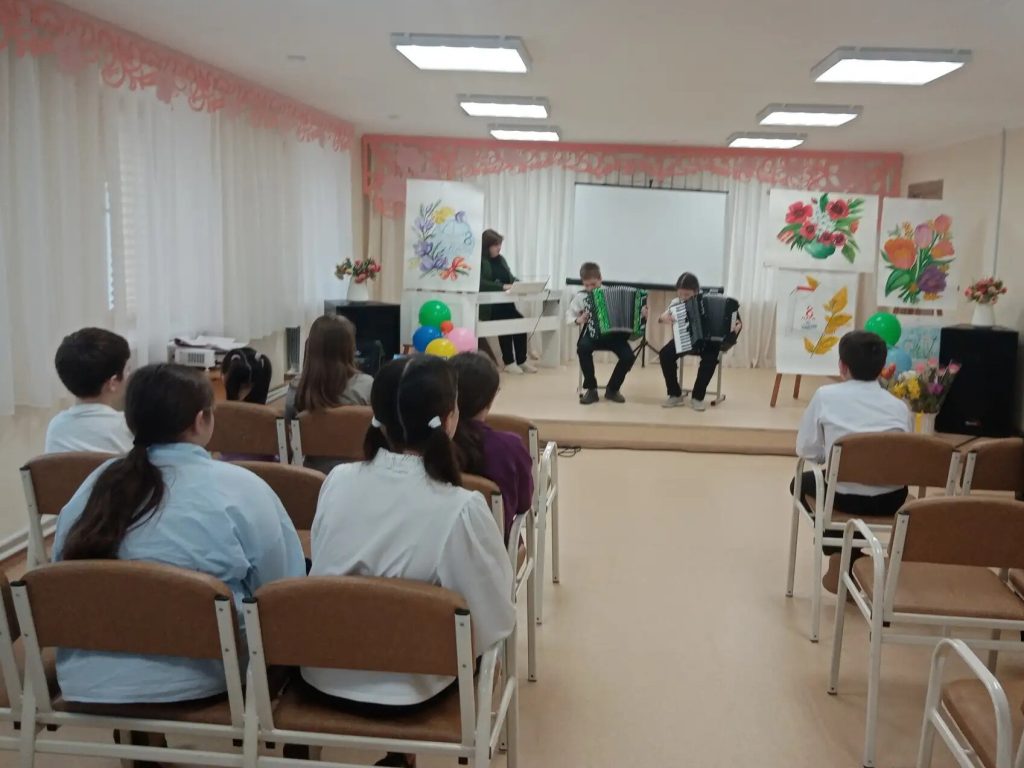 Зал расцвёл яркими красками — стены украсили рисунки учеников отделения ИЗО, которые словно сами тянулись к солнцу. А на экране оживала история: детям показали видео о том, как появился праздник 8 Марта, и рассказали о женщинах, которые первыми покоряли небо, науку, сцену и космос.