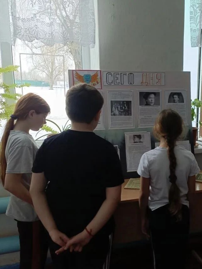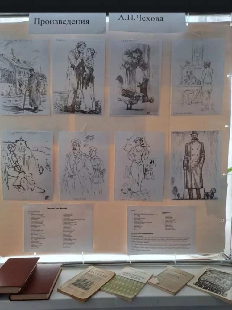 Рядом была организована книжная выставка с собранием сочинений Чехова. Особый интерес у ребят вызвали иллюстрации к рассказам «Дама с собачкой», «Хамелеон», «Каштанка» и другим классическим текстам. Учащиеся с увлечением знакомились с материалами, обсуждали сюжеты и характеры героев.