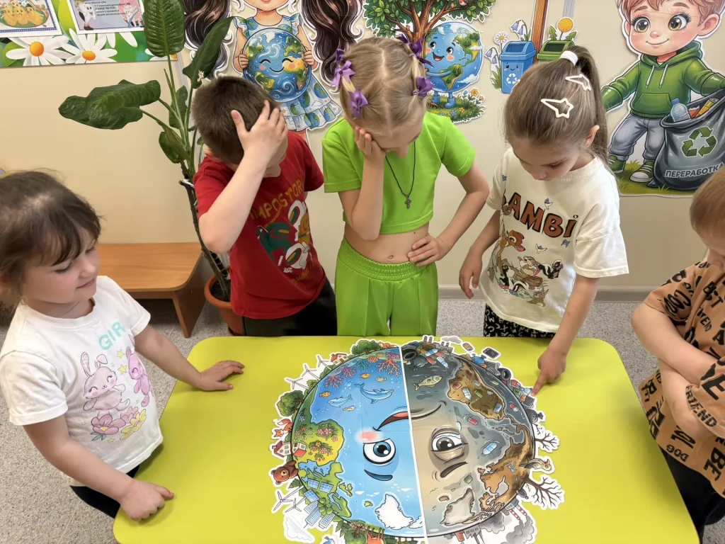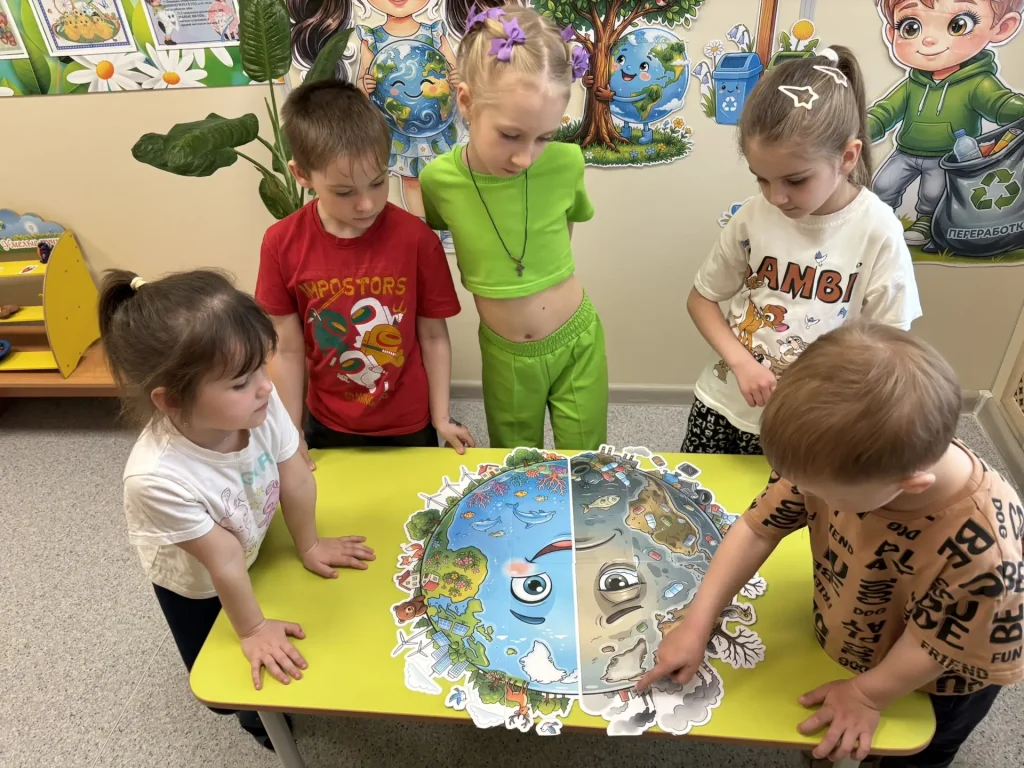 Занятие провела воспитатель Светлана Дмитриевна Васильченко — педагог с большим стажем, умеющий подать материал так, что дошколята запоминают его надолго и с интересом. Ребята рассматривали глобус, смотрели видеопрезентацию, увидели красоту планеты и обратили внимание на то, как её загрязнение вредит всему живому.