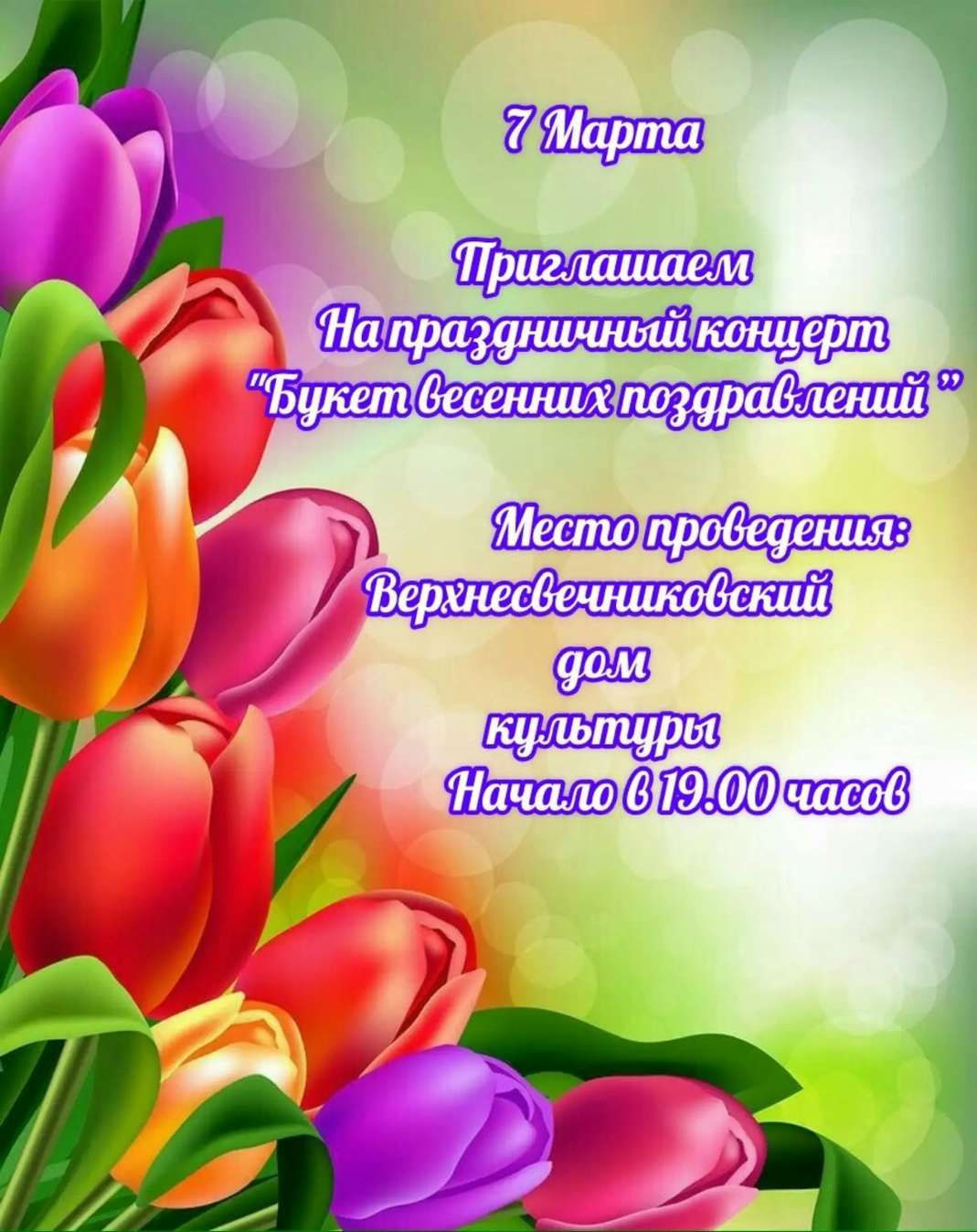 7 марта в 19:00 приглашаем всех на праздничный концерт «Букет весенних поздравлений». В программе — любимые песни, душевные стихи, яркие танцевальные номера и, конечно, море улыбок и хорошего настроения.