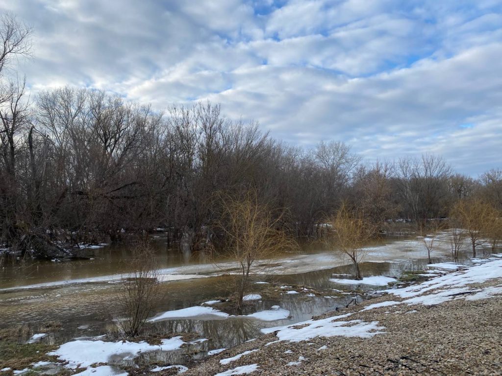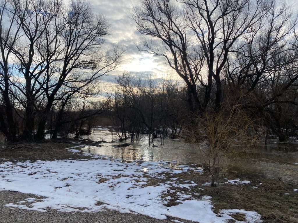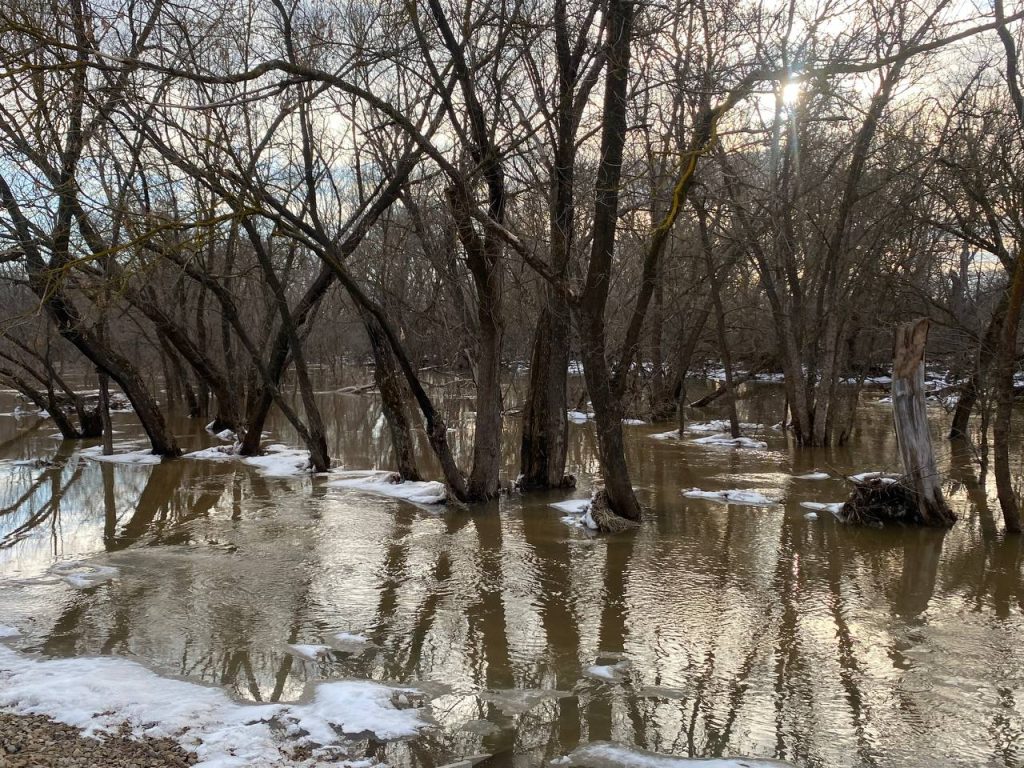 Природа устроила настоящий спектакль: низины у реки затопило, и деревья теперь стоят прямо в воде, отражаясь в зеркальной глади, как в огромном природном кадре. Картина завораживает — кажется, будто лес парит между небом и водой.