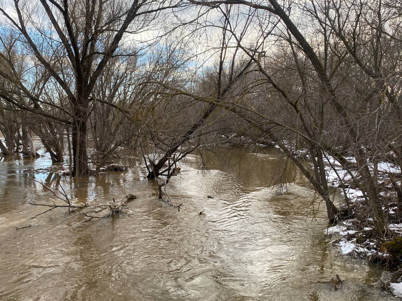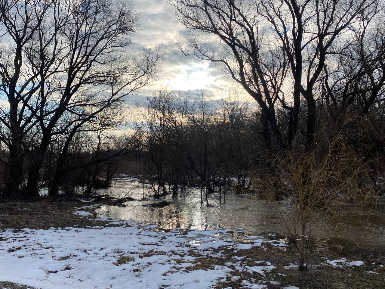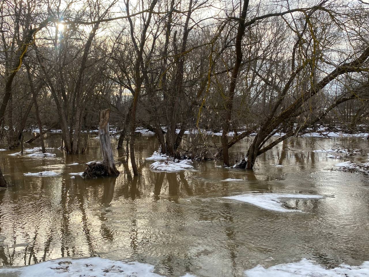 Природа устроила настоящий спектакль: низины у реки затопило, и деревья теперь стоят прямо в воде, отражаясь в зеркальной глади, как в огромном природном кадре. Картина завораживает — кажется, будто лес парит между небом и водой.